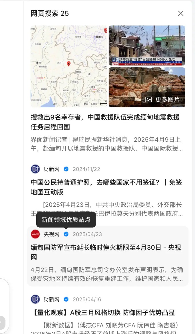 公司还称,为了帮助用户识别高质量信源,近期上线了专业、权威信源的蓝V徽章。点击引用来源的名称或链接,即可找到带蓝V徽章的专业信源,也可以方便地访问内容原始出处。