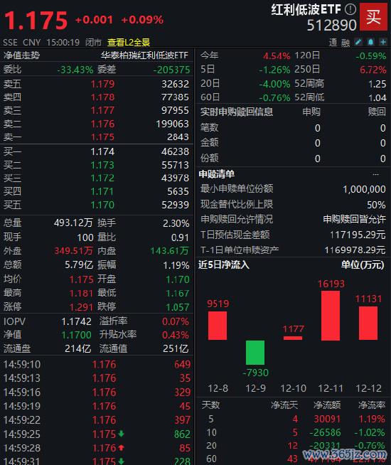12月15日,A股市场呈现震荡调整态势,沪指盘中一度翻红后再度回落,创业板指、深成指均跌逾1%。在此背景下,华泰柏瑞红利低波ETF(512890)逆势收涨0.09%,报1.175元。该ETF当日换手率达2.30%,成交额5.79亿元,位列同类标的ETF之首。