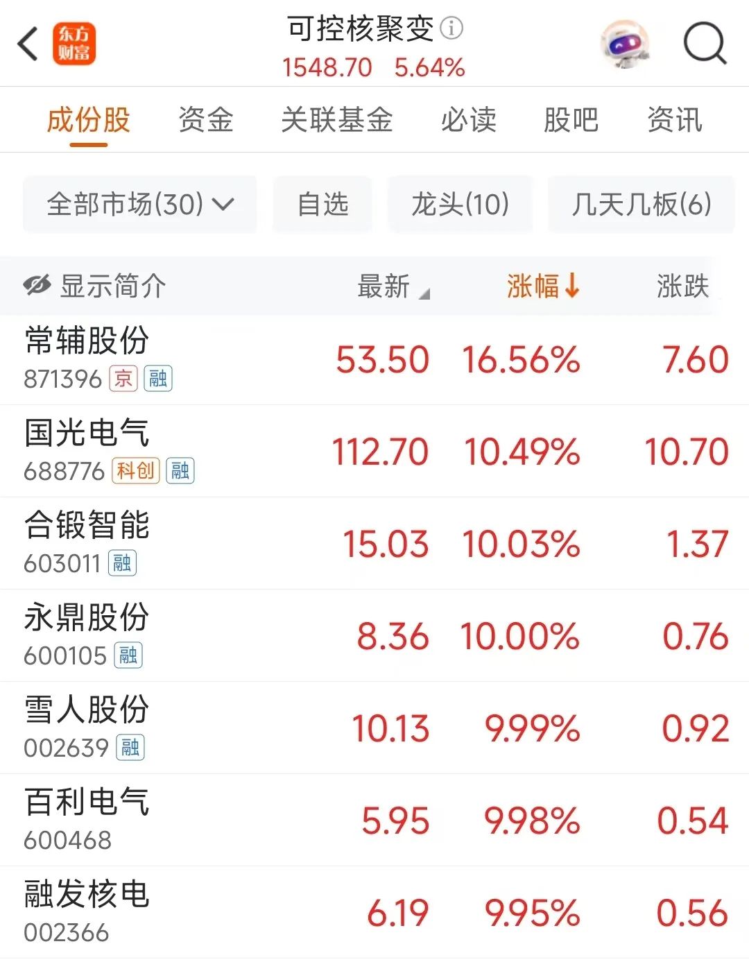 板块中融发核电(2连板)、雪人股份(2连板)、百利电气、永鼎股份、合锻智能纷纷涨停。国光电气、常辅股份大涨超10%。