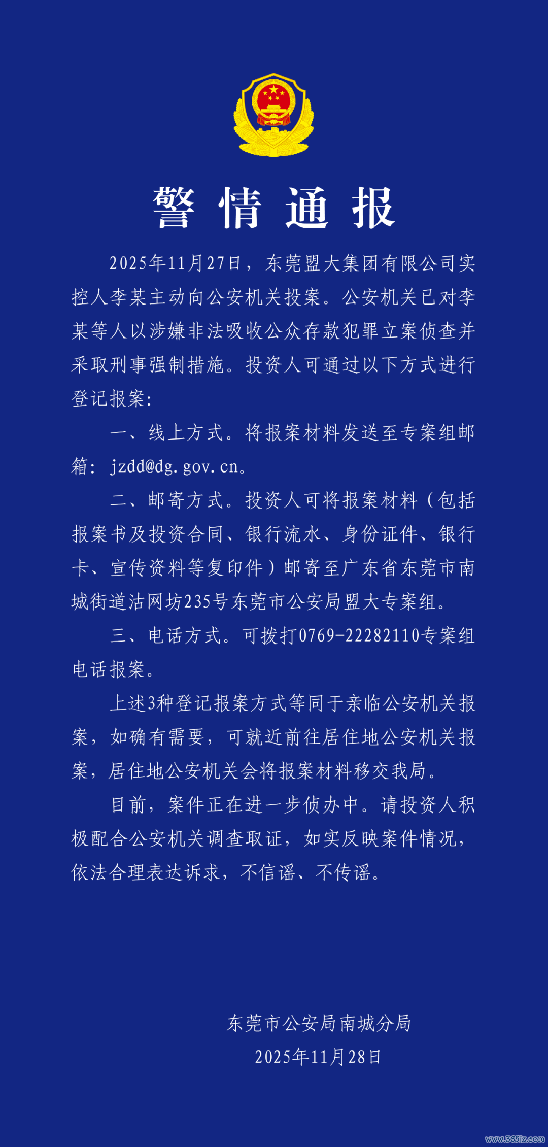 11月28日,广东东莞市公安局南城分局发布警情通报。通报称,11月27日,东莞盟大集团有限公司(下称“盟大集团”)实控人李某主动向公安机关投案。公安机关已对李某等人以涉嫌非法吸收公众存款犯罪立案侦查并采取刑事强制措施。目前,案件正在进一步侦办中。请投资人积极配合公安机关调查取证,如实反映案件情况,依法合理表达诉求趣炒股,不信谣、不传谣。